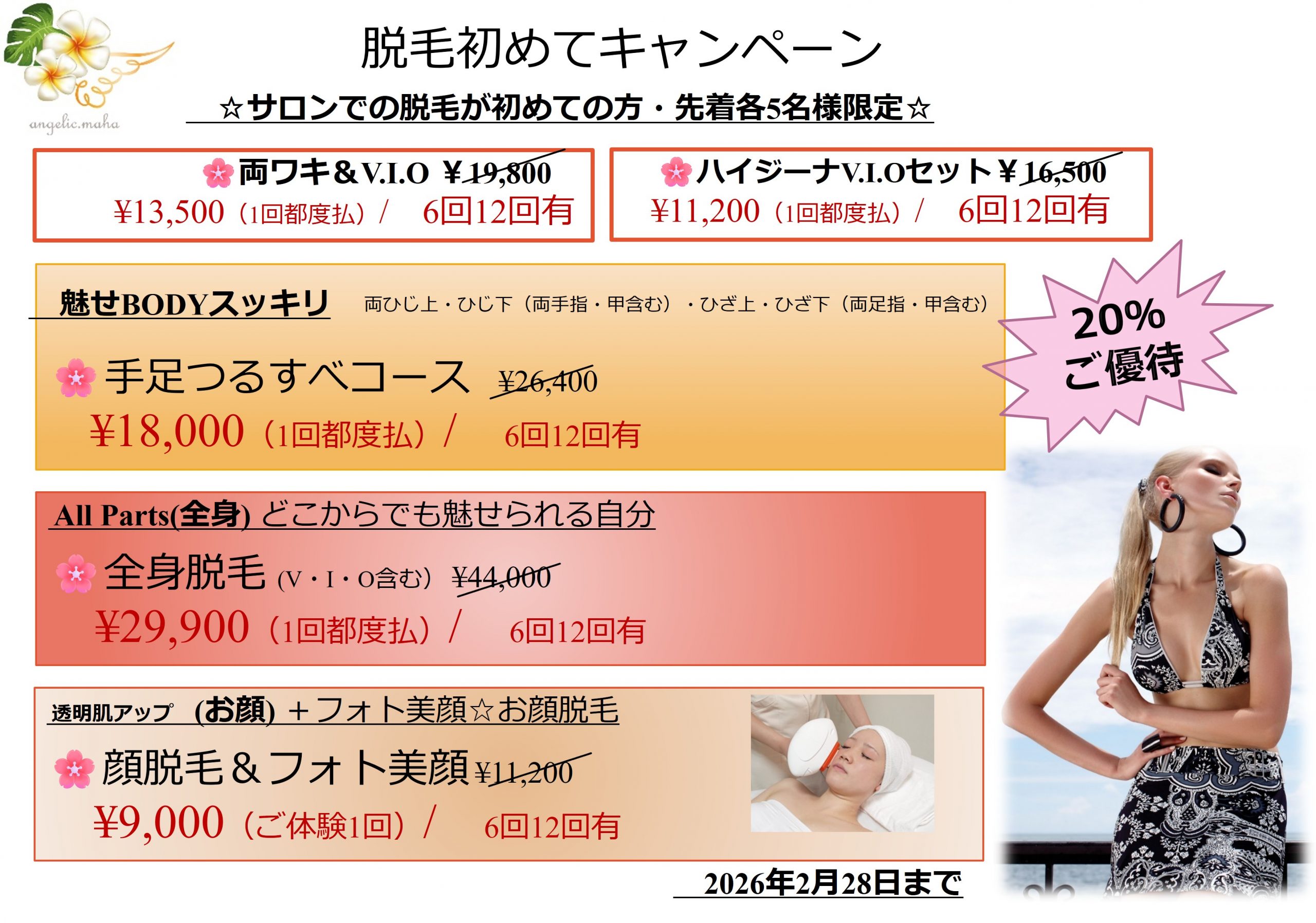 平日だけのご褒美価格。 都度払いで気軽に始める脱毛キャンペーンのお知らせです。 みなさまの「気になるところだけ、無理…
